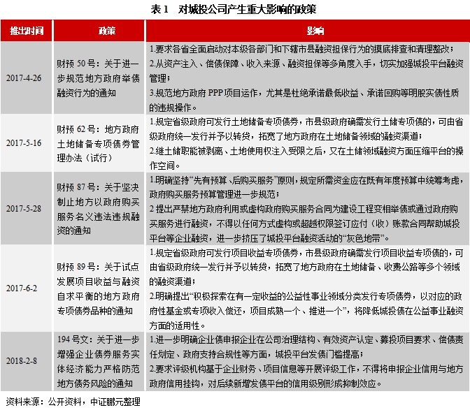 本文認(rèn)為:市場(chǎng)各方對(duì)該段表述反應(yīng)過(guò)度了。原因在于,相似的表述在2018年9月13日《關(guān)于加強(qiáng)國(guó)有企業(yè)資產(chǎn)負(fù)債約束的指導(dǎo)意見(jiàn)》(以下簡(jiǎn)稱“《意見(jiàn)》”)中曾出現(xiàn)過(guò)。《意見(jiàn)》第五部分第五條明確指出:“對(duì)嚴(yán)重資不抵債失去清償能力的地方政府融資平臺(tái)公司,依法實(shí)施破產(chǎn)重整或清算,堅(jiān)決防止‘大而不能倒”’,堅(jiān)決防止風(fēng)險(xiǎn)累積形成系統(tǒng)性風(fēng)險(xiǎn)。” 事實(shí)上,從《意見(jiàn)》發(fā)布至今,尚未有任何一家城投公司出現(xiàn)過(guò)公募債券違約的情形,更不用說(shuō)被依法實(shí)施破產(chǎn)重整或清算了。在AAA級(jí)國(guó)企“信仰”都被擊潰的情況下,城投債的“剛兌”仍然在持續(xù)。回望《意見(jiàn)》發(fā)布前不久已經(jīng)公布的對(duì)城投公司產(chǎn)生重大影響的政策(見(jiàn)表1)可知,監(jiān)管對(duì)于城投公司的態(tài)度在更早時(shí)候已經(jīng)轉(zhuǎn)為從嚴(yán)從緊,以各種方式方法來(lái)遏制因城投公司投融資行為導(dǎo)致的地方隱性債務(wù)是由來(lái)已久的監(jiān)管主線。因此,《意見(jiàn)》中提出上述較為嚴(yán)厲的監(jiān)管舉措在彼時(shí)也并不超出市場(chǎng)預(yù)期,兩年多之后的國(guó)發(fā)“5號(hào)文”重申這一表述則更是在預(yù)期之內(nèi)。