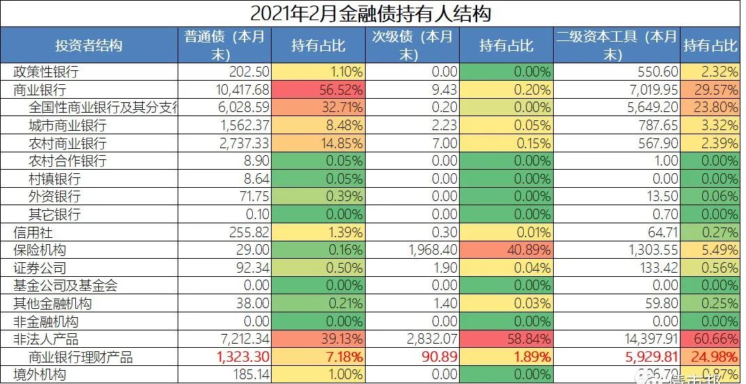 有意思的是,相比于對二級資本債的熱情,銀行理財對收益率更高的銀行永續債卻不那么感冒,2021年2月的數據顯示其持有占比不到2%。