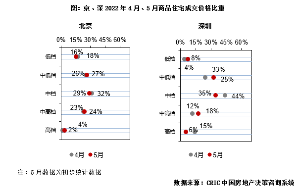 從價格段分布來看,低檔產品占比北京下降2pcts,深圳上升3pcts;中低檔產品占比北京和深圳分別上升1pct和3pcts;中檔產品占比北京和深圳分別下降2pcts和9pcts;北京中高檔、高檔產品分別上升3pcts和下降2pcts,深圳中高檔產品占比上升6pcts,高檔產品占比則下降8pcts。