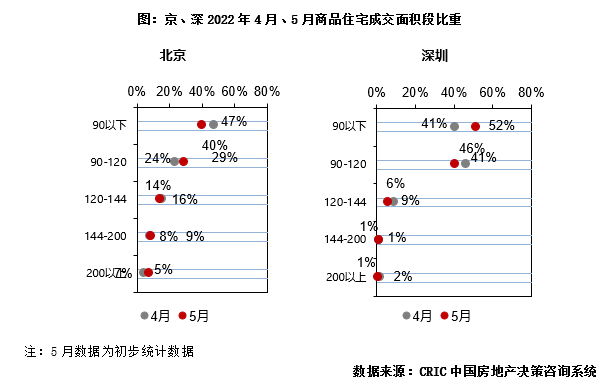 從面積段分布來看,90平方米以下產品占比北京下降7pcts,深圳上升11pcts;90-120平方米產品占比北京上升5pcts,深圳下降6pcts;120-144平方米產品占比北京和深圳分別下降1pct和3pcts;144-200平方米產品以及200平方米以上大戶型產品成交占比北京和深圳分別上升3pcts和下降2pcts。