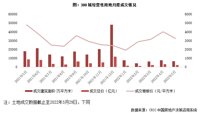 5月,全國300城經營性土地成交總建面6606萬平方米,環比下降16%,同比跌幅擴至63%;成交總金額2150億元,環比下降32%,同比下降75%。平均樓板價3255元/平方米,環比下跌19%,同比下跌32%。