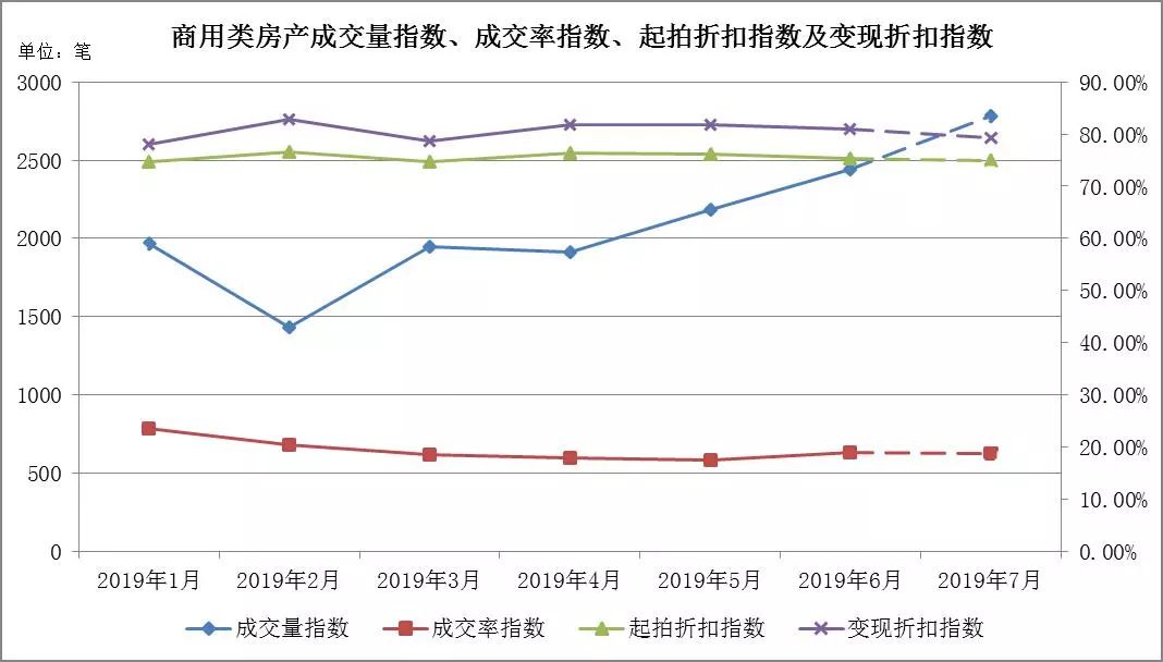 (一) 商用類房產(chǎn):成交量持續(xù)上升,成交率小幅增長,起拍折扣指數(shù)、變現(xiàn)折扣指數(shù)保持平穩(wěn)