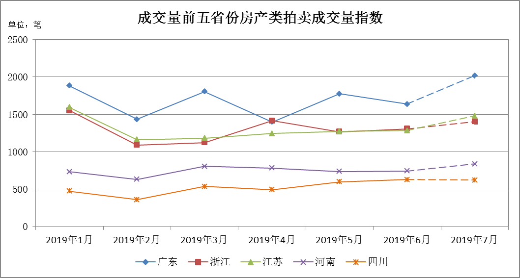 2019年1月至今,前五省的成交率趨勢較為一致,本月五省的成交率都有所下降,特別是廣東省,下降了近15個百分點。從今年整體趨勢來看,成交率從大到小排列依次為浙江、廣東、江蘇、河南、四川,江浙地區(qū)、珠三角地區(qū)經(jīng)濟發(fā)展水平較高,拍賣市場交易更為開放,拍賣成交的可能性也更大。