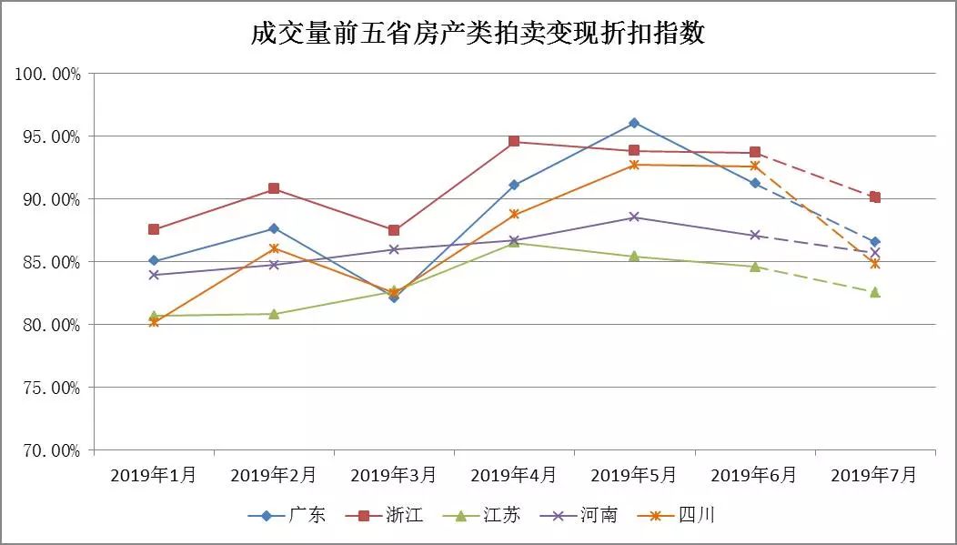廣東、浙江、江蘇穩(wěn)居房產(chǎn)類拍賣品成交量前三,本月四川省成交量進入前五;前五省的成交率指數(shù)與變現(xiàn)折扣指數(shù)均明顯下降,說明前五省的拍賣房產(chǎn)流動性與市場投資認可度都在降低。