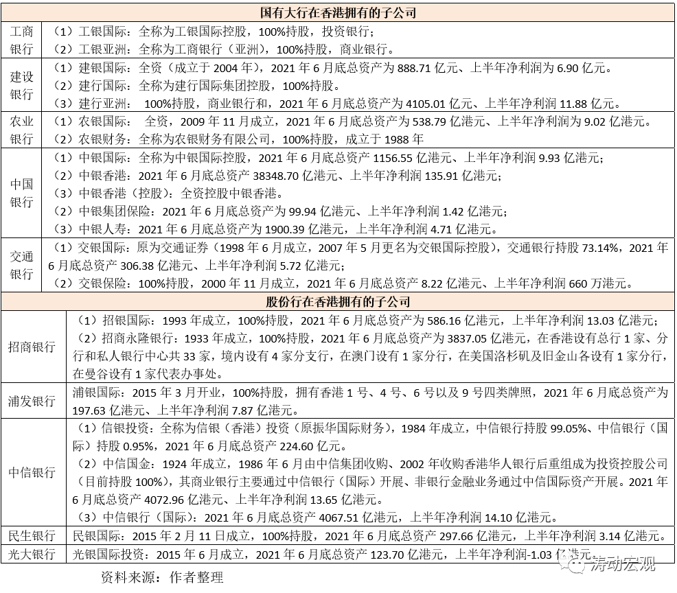(1)除郵儲銀行外的其余5家國有大行均在香港擁有子公司,工行擁有工銀國際、工銀亞洲,建行擁有建銀國際、建行國際、建行亞洲,農行擁有農銀國際、農銀財務,中行擁有中銀國際、中銀香港、中銀香港(控股)、中銀集團保險與中銀人壽保險,交行擁有交銀國際、交通銀行(香港)與交銀保險。