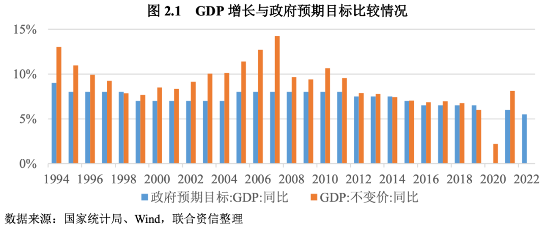 政府工作報告設定2022年經(jīng)濟增長目標,在去年下調(diào)至6%的基礎上,進一步下調(diào)至5.5%左右,為近30年來最低增長目標。聯(lián)合資信認為,經(jīng)濟增長目標適度下調(diào),更有利于穩(wěn)定增長和保證經(jīng)濟金融安全運行。在宏觀政策的強力托底作用下,部分領域行業(yè)的結構性風險或將有序緩釋。