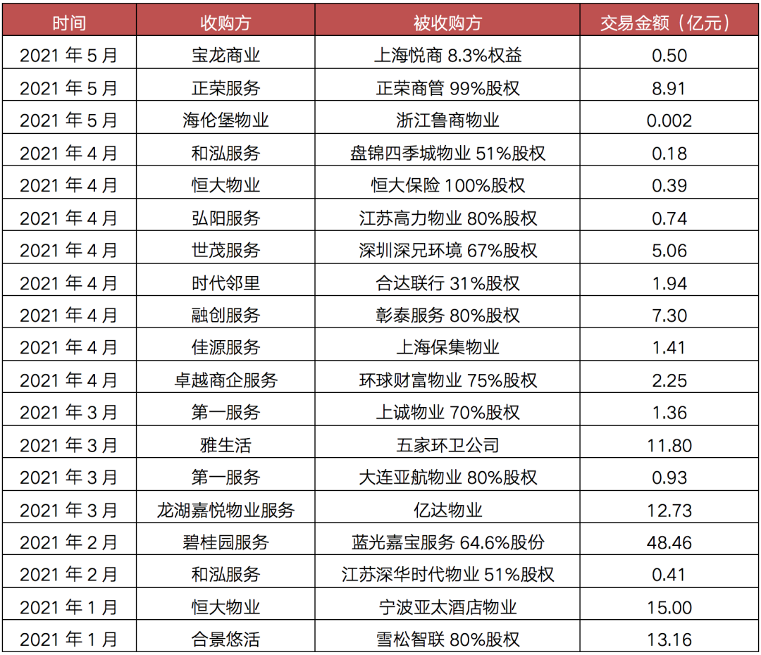 數(shù)據(jù)顯示,2021年以來物管行業(yè)的收并購熱度高漲,中小型收購事件持續(xù)不斷,據(jù)不完全統(tǒng)計,2021年至今物管行業(yè)的收并購事件總交易金額就已經(jīng)接近133億元,超過2020年全年的100億元。