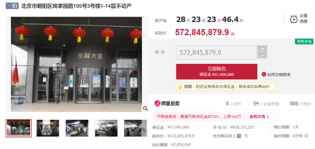 8月10日,阿里拍賣網(wǎng)顯示,北京市朝陽區(qū)姚家園路105號3號樓1-14層不動產(chǎn),即樂融大廈(此前名為樂視大廈),將于9月9日拍賣,起拍價5.73億元。