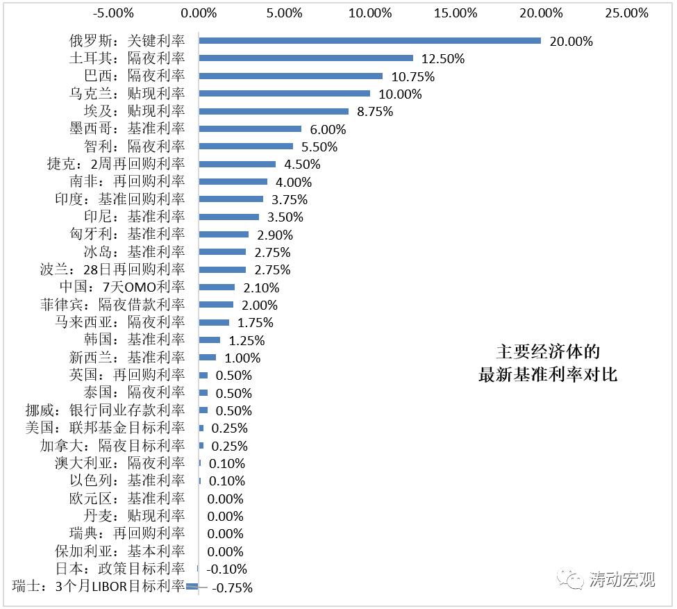 三、這里需要進一步討論,利率的本質是什么?我們的結論是利率某種程度上代表著風險溢價下的資本邊際回報率,當利率比較高時,意味著該經濟體要么缺資本,要么屬于高風險的動蕩地區,即資本的要價比較高。因此通常情況下可以這么認為,越不發達、社會越動蕩的經濟體,其資本越稀缺或風險較高,政策利率水平往往越高,因為只有給出足夠高的回報率才能吸引資本進來;越發達、社會越平靜的經濟體,其往往呈現出資本過剩的特征,因為資本的回報率開始趨于下降,或者說性價比在下降。實際上,從目前主要經濟體的政策利率來看,上述結論大致是能夠得到支撐的,如俄羅斯、巴西、土耳其、烏克蘭、埃及、墨西哥等經濟體均呈現類似特征。