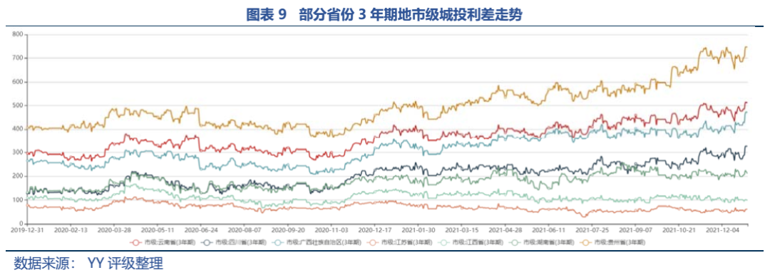 2021年,以康旅和云投為主,云南區域折價成交逐漸常態化,利差持續走闊。市場認可度趨弱的原因,首先是短板康旅的持續拖累,長期看邊陲省份的發展預期偏弱,還接連傳出“零容忍”輿情,治理能力與歷史遺留問題讓區域信用環境雪上加霜。