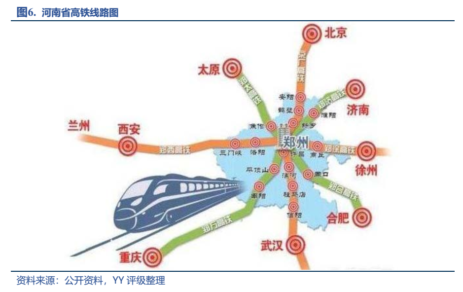 河南鐵路通車里程居全國第一,三橫五縱的鐵路網絡在此交匯,而鄭州作為京廣、隴海線的交匯點,素有中國鐵路心臟之稱,因此河南的高鐵建設基本也是以鄭州為核心,延省內各市鋪展而開,整體呈現(xiàn)米字型,有“橫”貫東西的徐蘭高鐵,“豎”連南北的京廣高鐵,“撇”望中原的鄭萬高鐵,“捺”指江南的鄭合高鐵,以及“點”通西北的鄭太、鄭濟(尚未開通)高鐵。另外中歐班列(鄭州)輻射30多個國家130多個城市,加大了開放的力度。