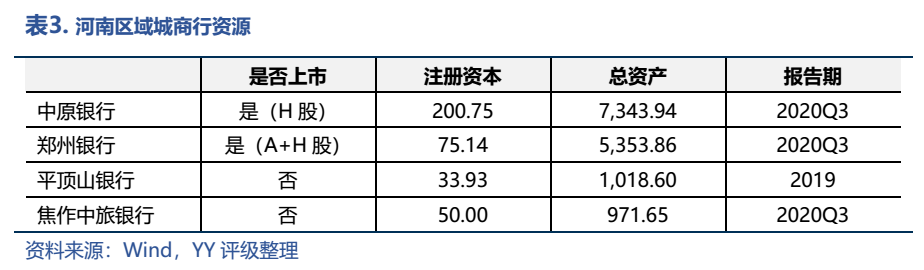 從金融實力上來看,河南的金融業(yè)不算發(fā)達,對河南信用債市場的托底作用并不明顯。截至2020年末,各項存款余額為76,446.19億元。區(qū)域銀行資源上,除了在調研過程中,發(fā)行人領導們均提到的鄭東新區(qū)已集齊12家股份制銀行之外,河南還擁有中原銀行、鄭州銀行、平頂山銀行和焦作中旅銀行四家城商行,其中中原銀行和鄭州銀行兩家上市銀行的資產規(guī)模過五千億;農商行規(guī)模基本上在500億以下。