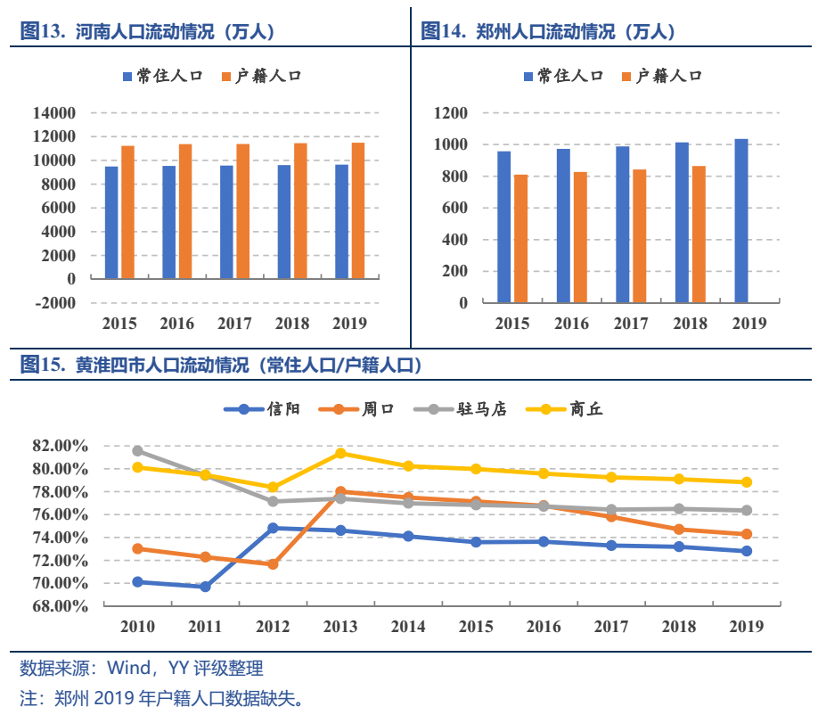 河南的人口體量很大(全國第三),整體處于凈流出的狀態(tài),2019年常住人口比戶籍人口少1,845.78萬人;除了省會鄭州保持相對較大規(guī)模的人口凈流入之外,其余大多數地級市均處于人口外流的狀態(tài),且常住人口增長緩慢,特別是渝東南塌陷區(qū)的周口、信陽、商丘、駐馬店,這黃淮四市的常住人口占全省常住人口的31%,是省內重要的糧食生產區(qū),但常住人口與戶籍人口的比例均低于80%,且凈流出的趨勢較前幾年更甚,是流出人口的主要來源地。