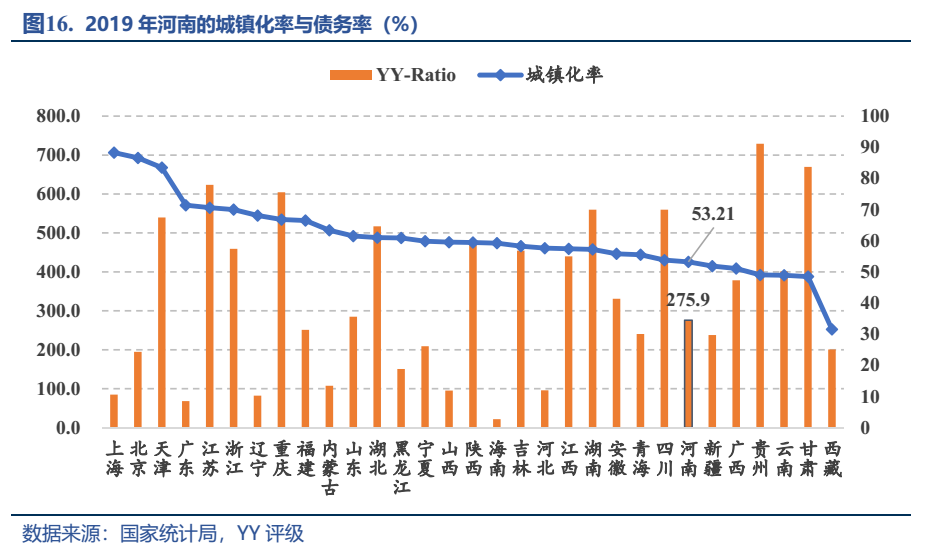 那么未來的河南到底怎么走?回溯過往,千百年來,中原大地鋪滿濃重的農耕底色,農業(yè)大省的定位讓其城鎮(zhèn)化率始終處于低水平區(qū)間,2017年首次突破50%,而2019年公布的河南城鎮(zhèn)化也僅為53.21%,遠低于全國60%的平均水平,位列倒數第五,未來政府建設、投資的空間較大。在舉債驅動城鎮(zhèn)化發(fā)展的模式下,河南相應的債務水平也處于低位線,2019年河南省YY-Ratio為275.9%,從低到高排名全國第十五。