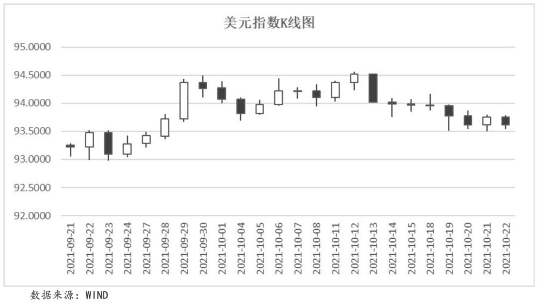本周,美元指數(shù)出現(xiàn)下跌。一方面,美國(guó)“褐皮書”顯示經(jīng)濟(jì)增速已呈現(xiàn)放緩的狀態(tài),打壓美元走勢(shì);另一方面,隨著美國(guó)PMI制造業(yè)數(shù)據(jù)的釋出顯示美國(guó)勞動(dòng)力和供應(yīng)鏈的問題仍將繼續(xù)限制制造業(yè)的恢復(fù),市場(chǎng)對(duì)美國(guó)經(jīng)濟(jì)的復(fù)蘇預(yù)期受到打壓。截至本周五,美元指數(shù)收于93.6116,周內(nèi)累計(jì)收跌0.38%。