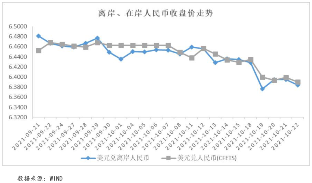 本周,中國(guó)三季度GDP增幅同比達(dá)4.9%,經(jīng)濟(jì)復(fù)蘇持續(xù)穩(wěn)定向好;而美國(guó)通脹問題持續(xù),經(jīng)濟(jì)恢復(fù)不確定性增加。因此,在岸和離岸人民幣匯率均呈現(xiàn)波動(dòng)走強(qiáng)態(tài)勢(shì)。截至周五,美元兌離岸人民幣匯率收于6.3839,周內(nèi)小幅下跌0.79%;美元兌在岸人民幣匯率收于6.3903,周內(nèi)累計(jì)收跌0.66%。