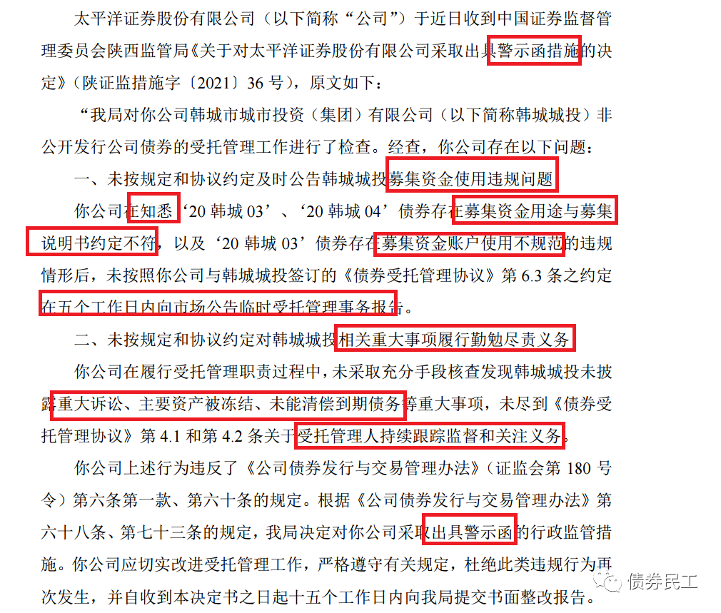 3、太平洋證券股份有限公司于2021年12月1日公告,陜西證監(jiān)局對公司出具警示函,主要原因是未能及時披露韓城市城市投資(集團)有限公司(募集資金使用違規(guī)問題和未履行重大事項勤勉盡責(zé)義務(wù)。