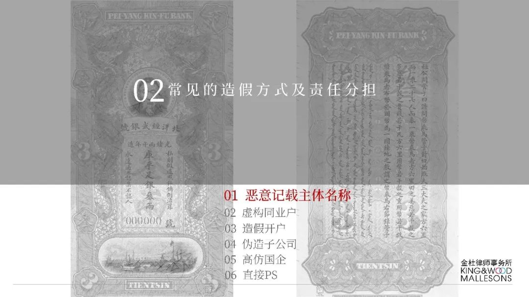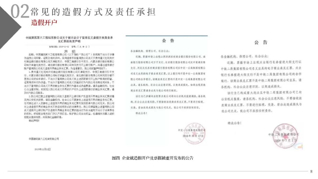 (一)不法分子精心設計、反復嘗試,通過在不同的銀行反復多次開戶的方式尋找開戶銀行的系統漏洞。利用部分開戶銀行未對票據行為人與實際開戶企業名稱進行一致性校驗的漏洞,通過在商業承兌匯票的承兌人名稱或保證人名稱上惡意記載為“中國某行”、“某行股份有限公司”或“某某銀行”的方式簽發電子商業承兌匯票,企圖冒充銀行承兌匯票;