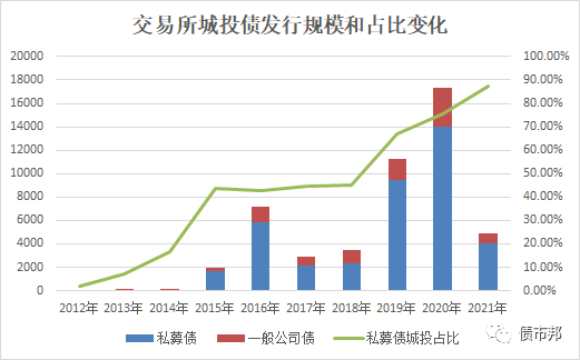 更加精確的說,交易所是選擇大力發展低層次城投發行人,區縣級城投私募債發行占比逐年攀升,目前占比已經將近50%。作為對比,2020年區縣級城投公司債中的占比僅為9%。這個差異說明,需要上報證監會注冊的一般公司債和僅需要交易所備案的私募債雖然都叫公司債,但其管理思路是有大不同的,不能混為一談。