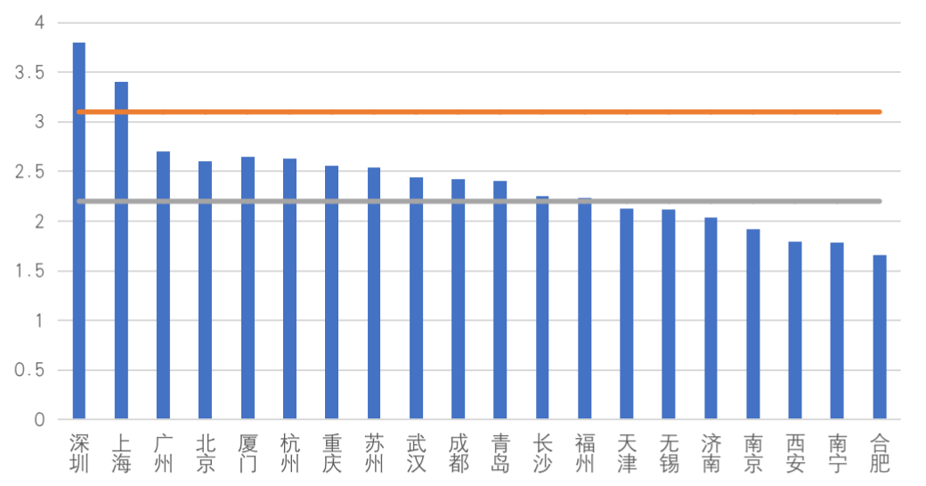 據CPIC克而瑞物管數據顯示,全國重點20城平均物業費為2.4元/㎡/月,在這其中,深圳最高為3.8元/平米/月,其次是上海,為3.4元/平米/月,深圳和上海是重點20城中僅有2個物業費超過3元/平米/月,受其影響,一線城市住宅平均物業費為3.1元/㎡/月。