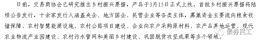 蘇州蘇高新集團(tuán)有限公司并不是唯一一個(gè)鄉(xiāng)村振興票據(jù)的發(fā)行主體。根據(jù)交易商協(xié)會(huì)官網(wǎng)公布的信息,鄉(xiāng)村振興票據(jù)包括十余家發(fā)行人,將涵蓋“糧食收儲(chǔ)保障、農(nóng)村智慧能源設(shè)施、農(nóng)村公路項(xiàng)目建設(shè)、企業(yè)向農(nóng)戶(hù)采購(gòu)原材料、農(nóng)產(chǎn)品基地運(yùn)營(yíng)、現(xiàn)代農(nóng)業(yè)物流產(chǎn)業(yè)園建設(shè)、農(nóng)村污水管網(wǎng)和美麗鄉(xiāng)村建設(shè)、鞏固脫貧攻堅(jiān)成果”等多個(gè)與鄉(xiāng)村振興相關(guān)的重點(diǎn)領(lǐng)域,通過(guò)金融手段助力農(nóng)業(yè)農(nóng)村優(yōu)先發(fā)展。