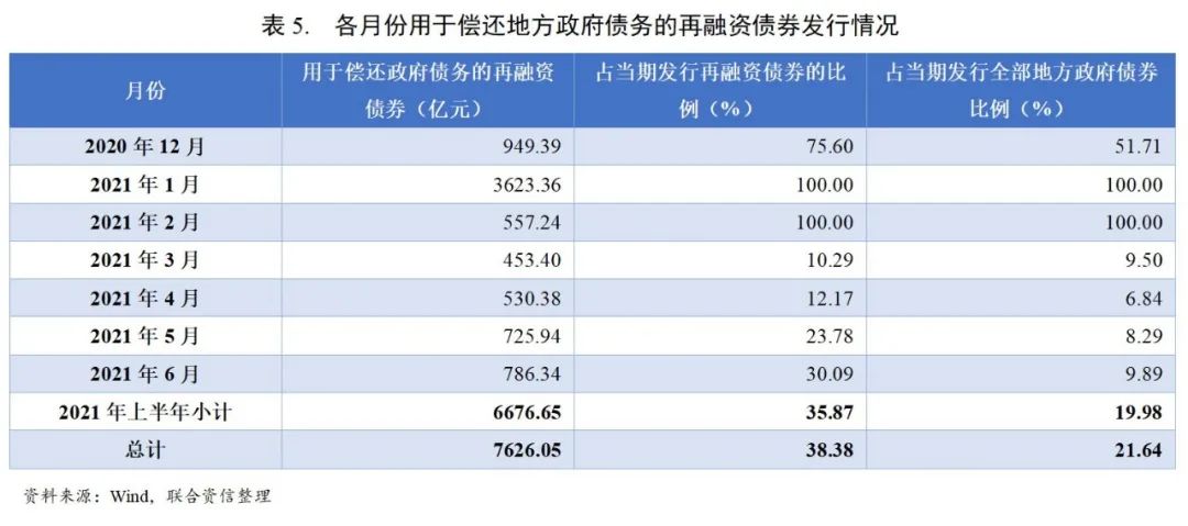 2020年12月及2021年上半年,用于償還政府債務的一般債券和專項債券分別為4177.93億元和3448.12億元,分別占同期發行再融資債券的比例為34.41%和44.63%,分別占同期發行全部地方政府債券的比例為24.82%和18.72%?;瘋猛緦m梻谠偃谫Y債券中的占比相對較高,或由于地方政府隱性債務的認定通常需要保證債務與公益性項目資產相對應,因此用于項目投資的專項債券或更適合對非債券形式的債務進行置換。
