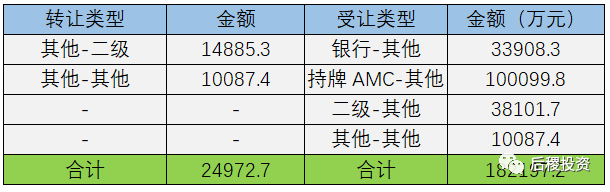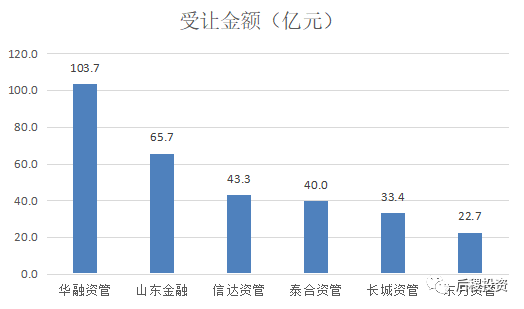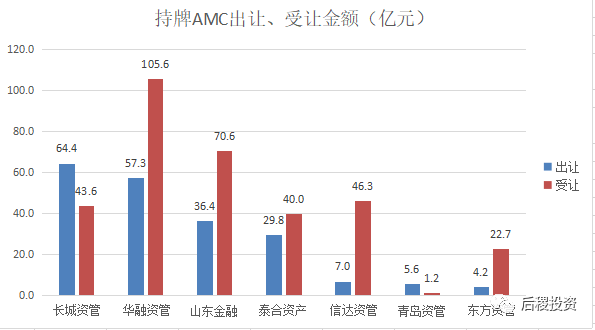 從出讓金額與受讓金額的對比中看,華融資管、山東金融、泰和資管、信達資管、東方資管受讓金額均大于出讓金額,則長城資管、青島資管受讓金額小于出讓金額。