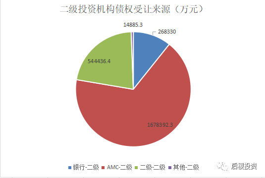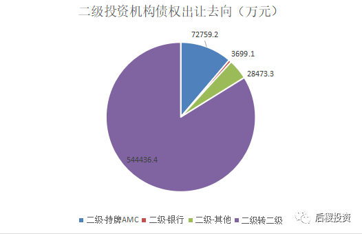 二級投資機構共受讓824戶,受讓金額250億余元。其中持牌AMC-二級投資機構為主要受讓來源,占三級受讓市場66%。相較2018年,二級投資機構債權受讓市場保持穩定,受讓金額相差不大。