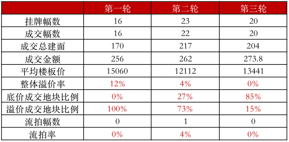 就溢價(jià)地塊比重來看,第三輪集中土拍成交的溢價(jià)地塊僅有3宗,比重僅有15%,底價(jià)成交成為三輪土拍主旋律。而無錫首輪集中土拍16幅地塊有15宗觸及最高限價(jià),溢價(jià)比重超100%;二輪22宗地塊中仍有9宗搖號成交,溢價(jià)比重達(dá)到73%。