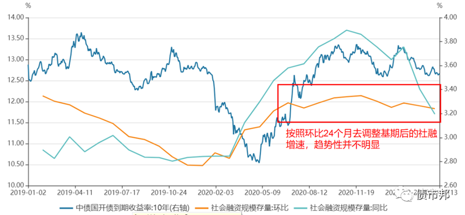 比如PPI同比增速高,央媽認(rèn)為主要是因?yàn)槿ツ晖诘突鶖?shù)的影響,大家也都認(rèn)可這個(gè)解釋;但社融拐點(diǎn)確認(rèn),看多的朋友卻完全不考慮去年高基數(shù)效應(yīng),直接用21年和20年進(jìn)行同比分析,總有一種雙標(biāo)的感覺,哪種口徑對(duì)結(jié)論有利我就用哪個(gè)……如果將2021年的社融存量和2019年的同期進(jìn)行對(duì)比,排除掉疫情期間高基數(shù)影響后,可以看到趨勢(shì)性并不是太明顯。