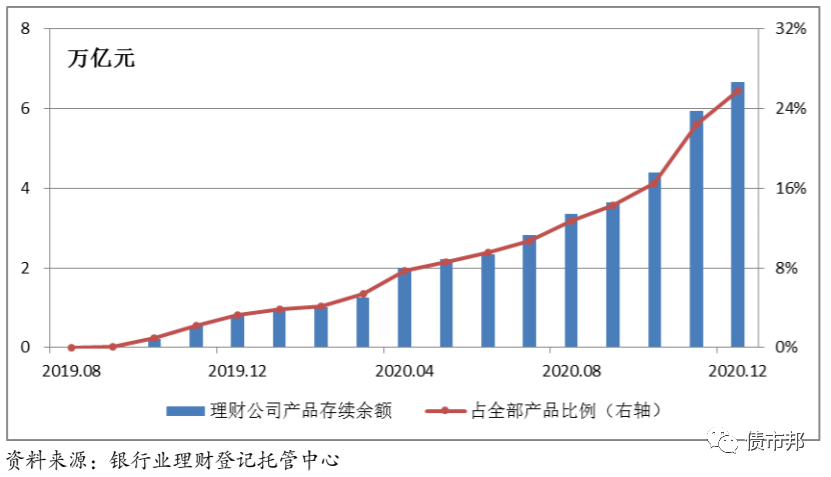 資管機(jī)構(gòu)方面,近期欠配壓力最為明顯的還是集中在商業(yè)銀行理財(cái)子公司上。隨著資管新規(guī)持續(xù)深化和理財(cái)子公司業(yè)務(wù)的發(fā)展,銀行資產(chǎn)管理部過去發(fā)行的,可以投資于非標(biāo)的老產(chǎn)品到期后,里面的資金往往進(jìn)入到同一銀行理財(cái)子公司發(fā)行的主要配置于標(biāo)類債券的新產(chǎn)品。從理財(cái)托管中心公布的數(shù)據(jù)看,商業(yè)銀行理財(cái)子公司發(fā)行的新產(chǎn)品規(guī)模從2020年初的不到1億元上漲到2021年初的6.67萬億元,且持續(xù)保持著快速增長。
