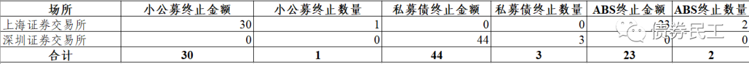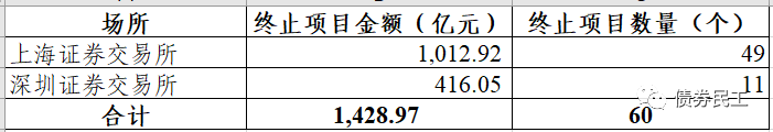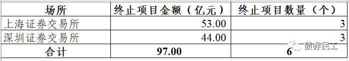 根據(jù)上海證券交易所和深圳證券交易所公司債券項目信息平臺的公開信息,2022年5月終止的債券項目(小公募、私募債和ABS)金額合計為97億元,終止項目數(shù)量6只。