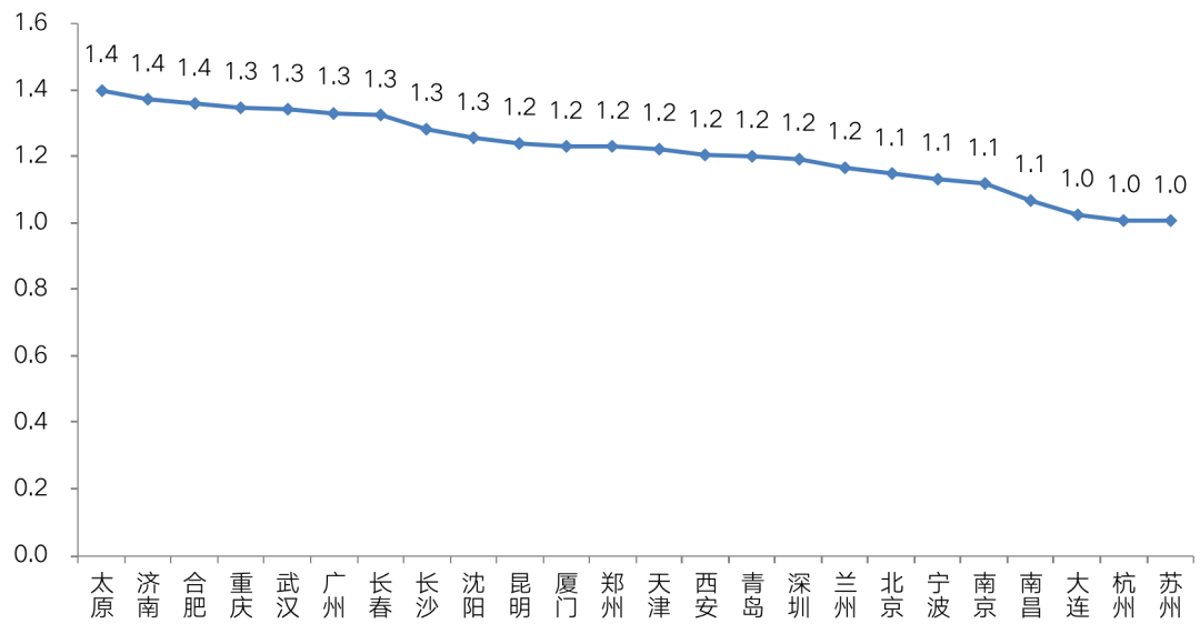 相比之下,杭州、寧波、南昌等供求比較均衡(供求比均在1.1及以下)的城市,流拍率則處于相對較低水平,溢價率也處于相對高位。典型如杭州,2020年涉宅土地流拍率(按幅數)僅有2%,而溢價率卻高達21%,土地市場熱度明顯高于供求比較高的城市。