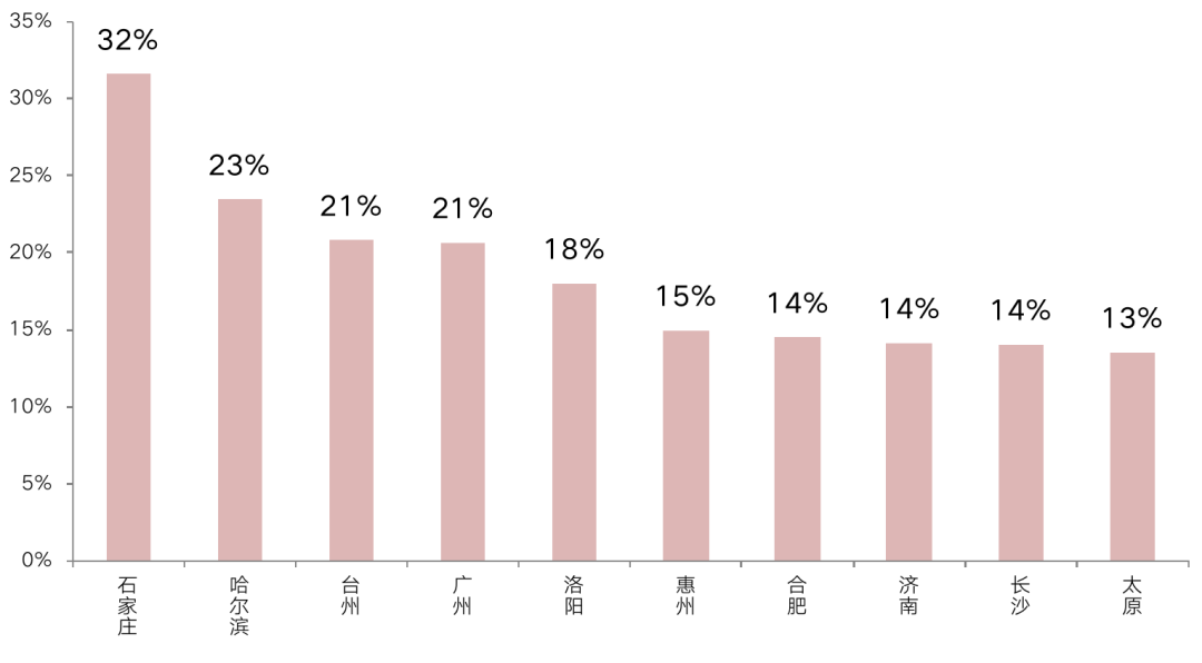 分城市來看,24個重點一二線城市中供求比超1.3的城市達到了三成,其中太原、濟南、合肥等城市表現尤為突出,供求比均超1.35,土地流拍占比相對較高。CRIC監測的重點城市流拍數據(按幅數)顯示,三城均是流拍率TOP10城市,流拍率都超過了12%,均是流拍的“重災區”。即便是成交地塊,溢價率水平也相對較低,以今年商品房市場表現欠佳的濟南為例,涉宅土地溢價率僅有4%,多宗土地為底價成交,土地市場非常蕭條。