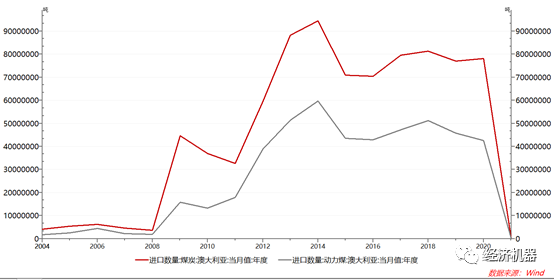 其他因素。比如中澳關(guān)系惡化下,中國(guó)自澳大利亞進(jìn)口的煤炭和動(dòng)力煤從每年的8000萬(wàn)噸和4000萬(wàn)噸,下降至0(圖11)。這個(gè)數(shù)雖然只占全年消費(fèi)量的1%-2%,但在供需格局接近平衡的情況下,確實(shí)放大了供給彈性。國(guó)內(nèi)方面,很多煤炭大省加大反腐力度,倒查好多年,而能源行業(yè)歷來(lái)是腐敗重災(zāi)區(qū),確實(shí)也對(duì)煤炭行業(yè)的的風(fēng)險(xiǎn)偏好有一定抑制。