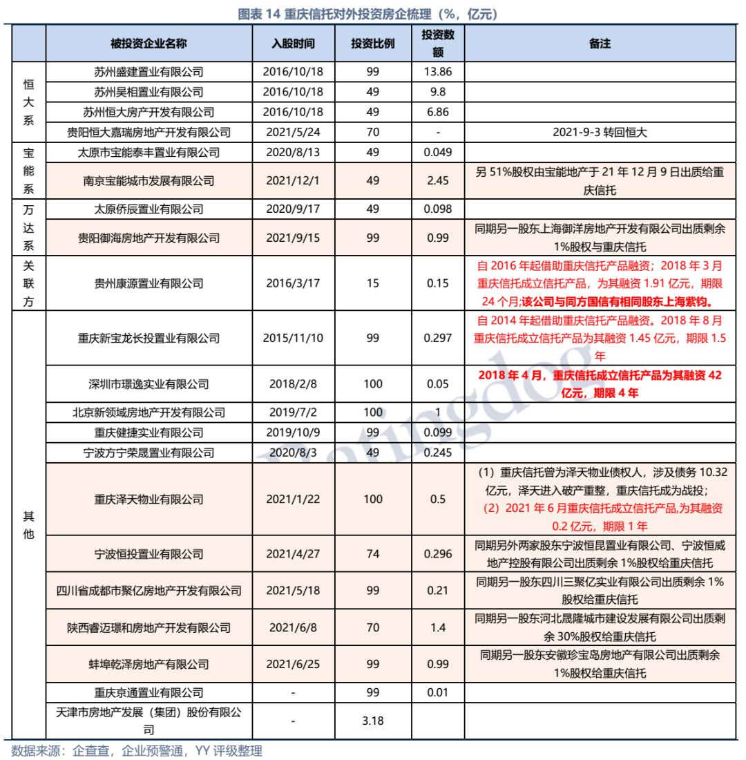 因同方國信子公司獨立性較強,我們主要梳理了本部的資產以及測算了債務壓力和短償債能力。資產方面,以信托投資(交易性金融資產103億元主要為信托投資)、民生銀行股票(最新市值約73億元,已質押,2019年來市值縮水37%)、重慶信托67%股權(賬面以成本法計量僅20億元,但按重慶信托最新凈資產計量則價值282億元)為主;債務方面,19年以來,本部有息債務水平有所降低(主要通過可供出售金融資產變現償還),截至21年中,有息債務205億元,短債107億元,22年將有64億元債券到期或行權,短債壓力較大。測算短期可變現資源,預計短期內變現能力比較確定的僅約22億元,要覆蓋22年內到期或行權的64億元債券還有較大缺口,可能需要關注信托投資資產或者牌照的價值(比較難及,且由于重慶信托股權不可質押,且前文所描述,重慶信托的真實控制權在新渝富的持股鏈條上,同方國信更多是居于財務投資這一角色,可能如果臨時出現兌付危機,假設重慶信托的資產質量仍有支持,股權仍有較高價值)。