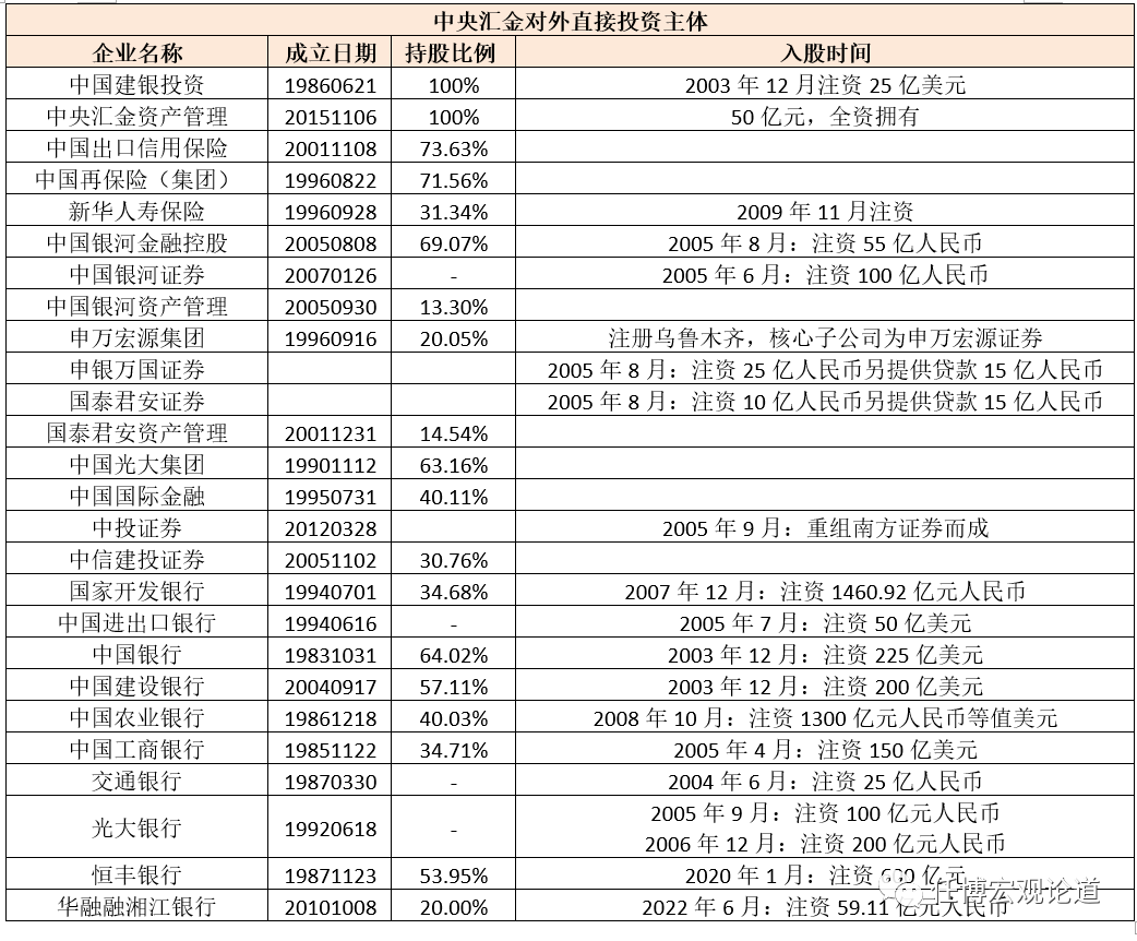 (一)2003年12月16日,中央?yún)R金成立(注冊資本8282.09億元),成立時注冊資本為3724.65億元,其主要職能是代表國家行使對重點金融企業(yè)的出資人的權(quán)利和義務(wù)。其中,中央?yún)R為中投的全資子公司,而后者被稱為中國版的主權(quán)財富基金,是國資委的全資子公司。