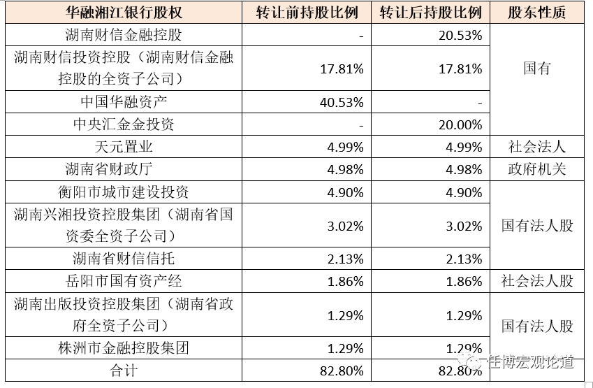 本次轉(zhuǎn)讓后,意味著華融資產(chǎn)將退出華融湘江銀行的股東序列,湖南財信系以湖南財信金融控股、湖南財信投資控股和湖南財信信托的名義合計持有華融湘江銀行40.47%的股權(quán),成為后者的第一大股東,而中央?yún)R金則以20%的持股比例成為華融湘江銀行的第二大股東。