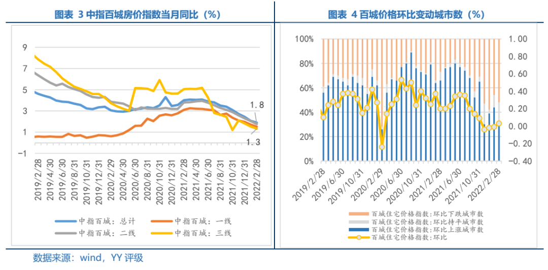 從成交價格看,隨著調控加碼和房企流動性問題的逐漸暴露,一二三線城市房價指數增長速度在21年中達到階段性高點后旋即向下,房價上漲支撐動力不足。22年2月一二線線房價指數同比分別增長1.5%/1.8%/1.3%,其中三線城市漲幅較21年中下降2.9pct,以價換量思路明顯,但預期轉變下恐較難穩住銷售。