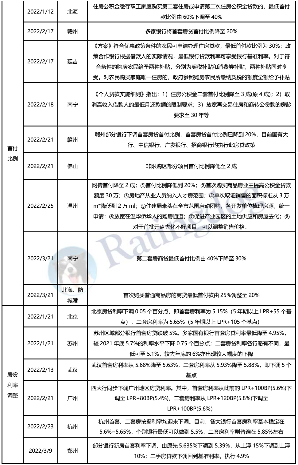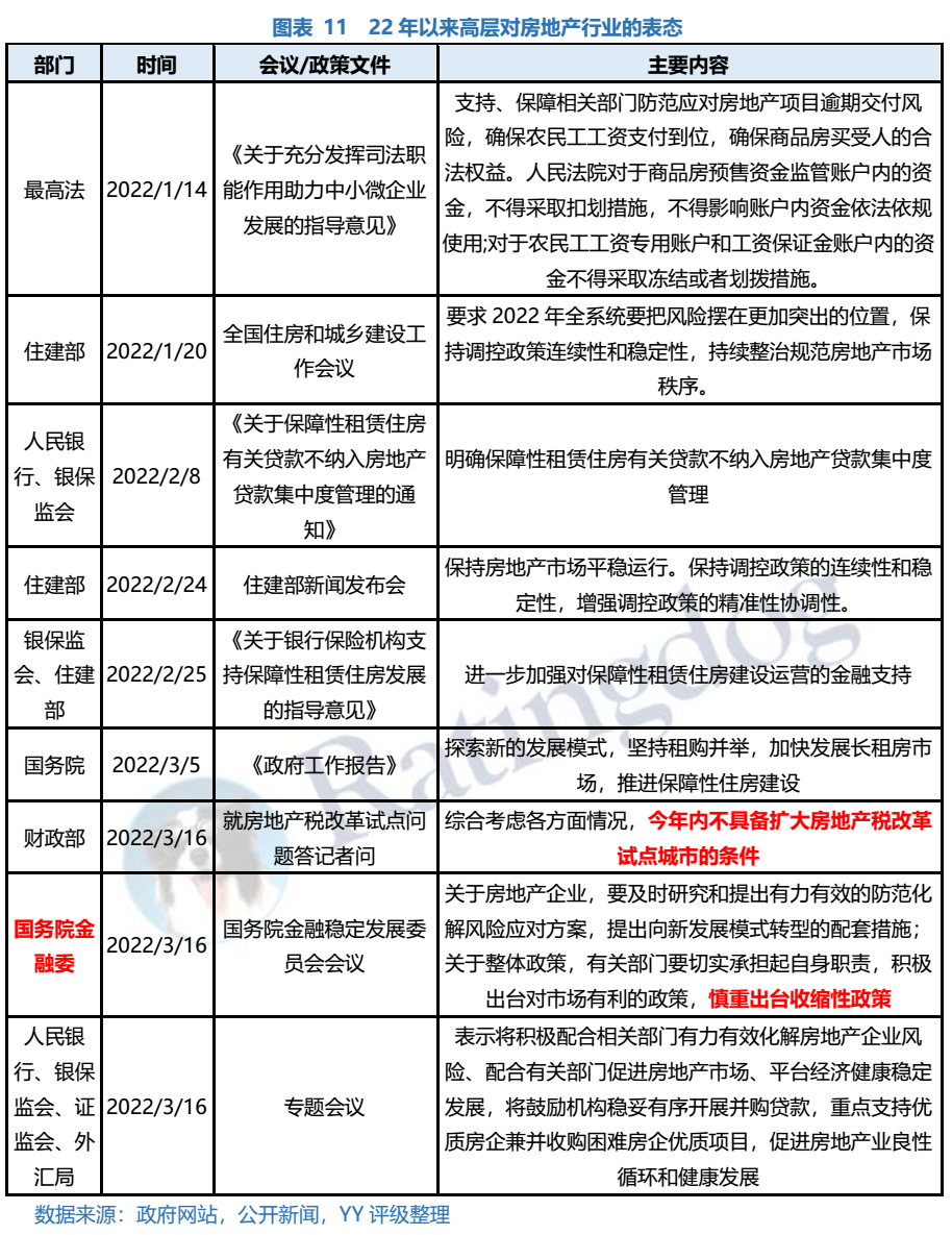隨著行業銷售持續下滑以及主體暴雷頻繁,政策托底的力度愈加顯現,尤其是3月16日國務院金穩會強調“積極出臺對市場有利的政策,慎重出臺收縮性政策”,更是從高層態度方面給市場打了一劑強心針。但同時行業內融創這樣體量和排名主體的展期對行業沖擊力不可忽視,預期后續政策除了托底銷售和拿地外,對主體層面、已出險企業的風險化解還將進一步落實。