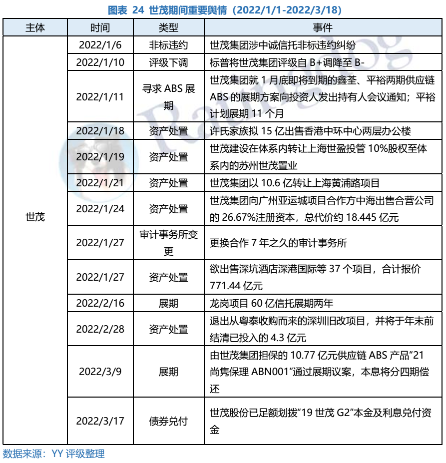 2022年1月1日至3月18日,YY評級綜合評估行業基本面、個體信用資質及負面輿情等因素,下調42家地產主體評級,即包括目前面臨流動性或再融資困境的民營房企,也包括經營能力較弱的央企/國企地產主體。
