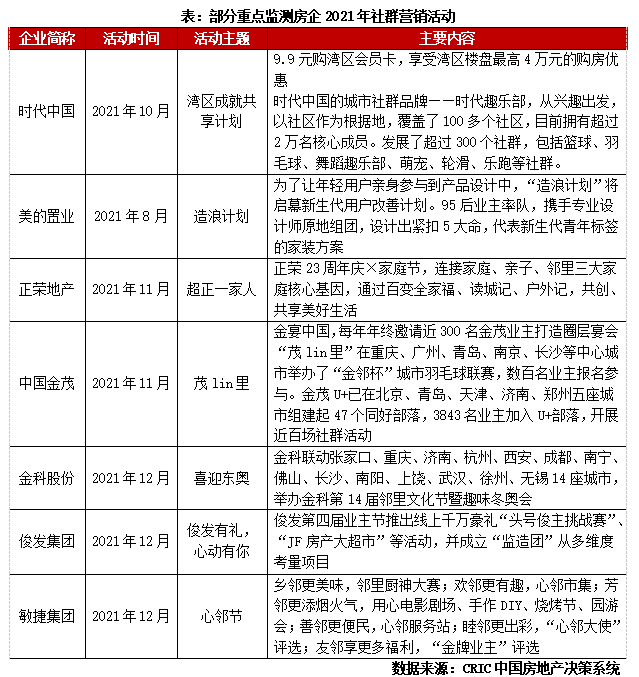 目前房企的社群活動主要可以分為三類,第一類是簡單的聚集活動,可以是由企業組織的,如金茂U+已在北京、青島、天津、濟南、鄭州五座城市組建起47個同好部落,3843名業主加入U+部落,開展近百場社群活動。金科鄰里文化節暨趣味冬奧會,綠城“綠粉圈子”功能等都屬于這一類。第二類是由企業組織一些業主關懷和回報活動,如金茂每年都會在年終的時候舉辦“金宴中國”活動,邀請近300名業主共聚一堂打造圈層社交,提升客戶體驗??“l第四屆業主節于今年12月15日正式啟幕,為了提高業主參與度,今年以“俊發有禮 心動有你”為主題,不僅規劃了線上萬人挑戰時尚樂玩、海量房源一站式選購等活動,還成立了由業主和媒體代表組成的“監造官”,親自走進項目,從工程質量、品質細節、工藝標準等維度考量項目,以體現俊發的“三心”服務。