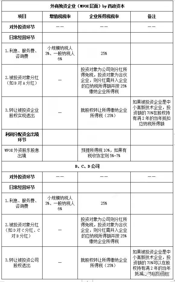 外商投資所涉稅費情況、各地對外資機構的總部獎勵、稅收優惠及返還以及資金是否能順利售匯出境亦是外資機構在投資前重點權衡的內容。以搭建“外資資金—A(外商投資投資性公司,WFOE)—B—C—D”架構為例,外資機構境內投資相關稅費如下: