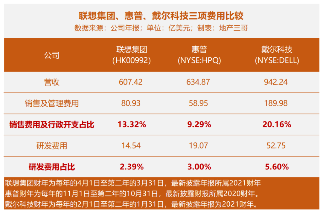 研發費用占營業收入比例來看:聯想、惠普、戴爾2.39%、3.00%、5.60%。聯想最低。