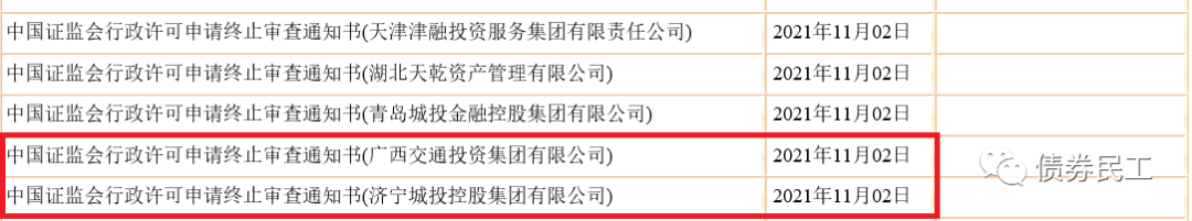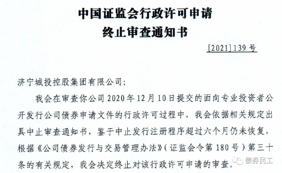 2、濟(jì)寧城投控股集團(tuán)有限公司于2020年12月10日提交的面向?qū)I(yè)投資者公開(kāi)發(fā)行公司債券被終止,債券擬發(fā)行金額為30億元。濟(jì)寧城投控股集團(tuán)有限公司的實(shí)際控制人為濟(jì)寧市國(guó)資委,主體信用評(píng)級(jí)為AA+(中誠(chéng)信國(guó)際、大公國(guó)際和中證鵬元),目前存續(xù)債券金額為154.50億元,存續(xù)債券只數(shù)17只,存續(xù)債券產(chǎn)品包括公司債券、企業(yè)債券和債務(wù)融資工具。