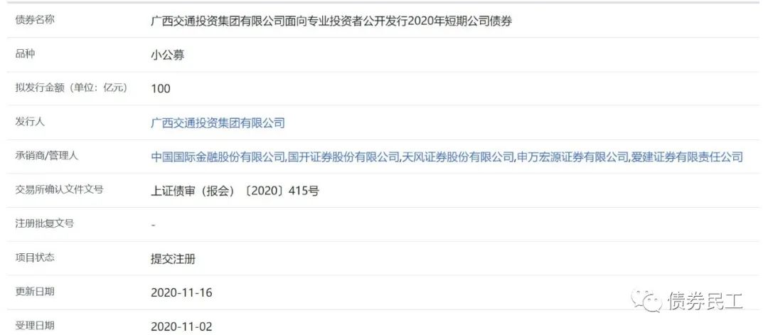 1、廣西交通投資集團(tuán)有限公司于2020年11月17日提交的面向?qū)I(yè)投資者公開(kāi)發(fā)行2020年短期公司債券被終止,擬發(fā)行金額為100億元。廣西交通投資集團(tuán)有限公司的實(shí)際控制人為廣西壯族自治區(qū)國(guó)資委,主體信用評(píng)級(jí)為AAA(中誠(chéng)信國(guó)際、大公國(guó)際和聯(lián)合資信),目前存續(xù)債券金額為244.70億元,存續(xù)債券只數(shù)20只,存續(xù)債券產(chǎn)品包括公司債券、企業(yè)債券、債務(wù)融資工具和境外債。