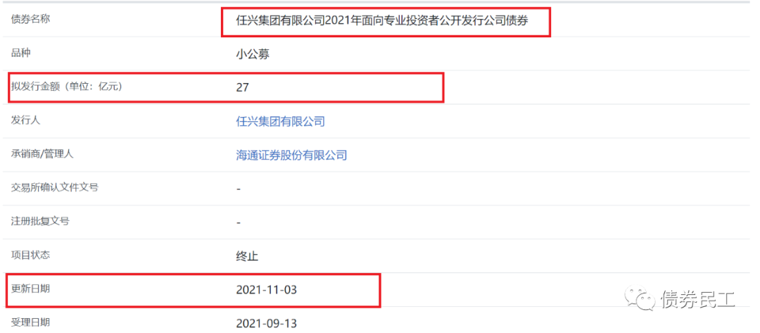 就在2021年11月3日,濟(jì)寧市另一城投公司——任興集團(tuán)有限公司申報(bào)的總額為27億元的小公募公司債券被上交所終止。任興集團(tuán)有限公司的實(shí)際控制人為濟(jì)寧市任城區(qū)國(guó)有資產(chǎn)運(yùn)營(yíng)服務(wù)中心,目前存續(xù)債券金額64億元,存續(xù)債券9只,存續(xù)債券產(chǎn)品為私募債和PPN。