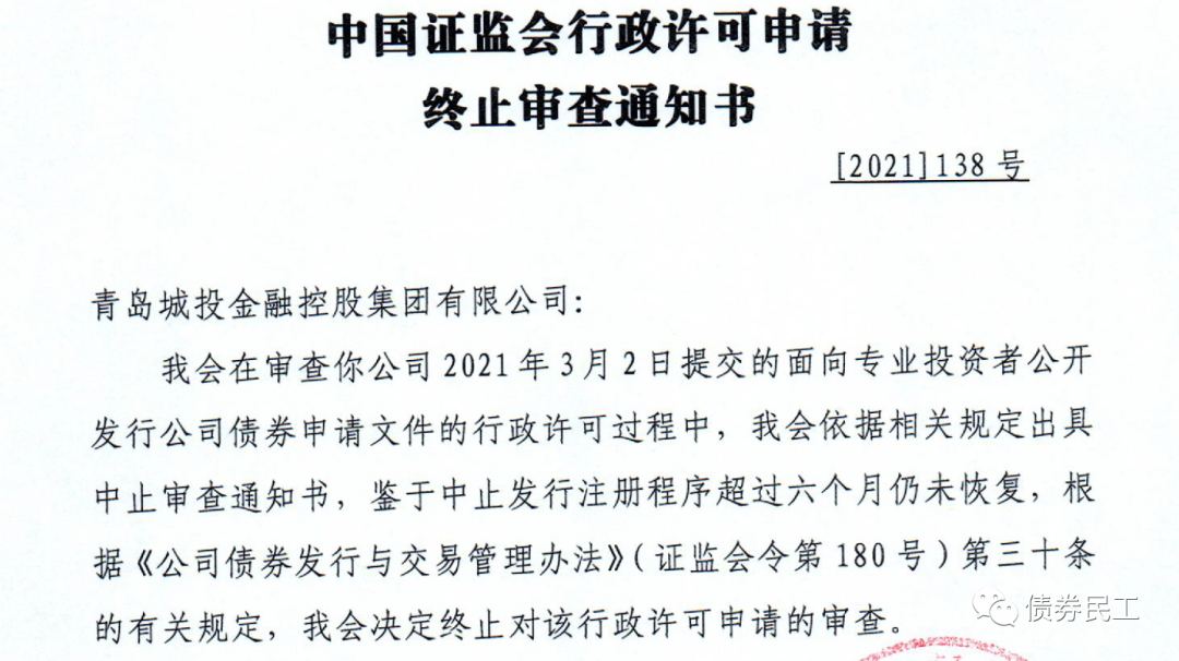 上述終止的公司債券項(xiàng)目中,值得關(guān)注的是青島城投金融控股集團(tuán)有限公司,2021年3月2日申報(bào)的2021年公開(kāi)發(fā)行公司債券(面向?qū)I(yè)投資者)被終止,債券擬發(fā)行金額為30億元。