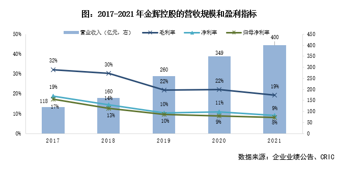值得注意的是,2021年高權(quán)益比的并表項(xiàng)目陸續(xù)進(jìn)入結(jié)轉(zhuǎn),導(dǎo)致金輝少數(shù)股東損益占比同比減少6.77pct至11.34%,實(shí)現(xiàn)歸母凈利潤(rùn)32.75億元,同比增長(zhǎng)4.71%,對(duì)應(yīng)歸母凈利率8.18%,同比減少0.8pct,利潤(rùn)率仍有待提升。