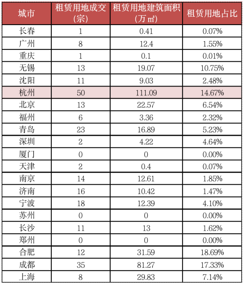 從首批租賃用地成交情況來看,杭州競(jìng)自持用地高達(dá)41宗,占比超七成,其中已成交涉租賃用地成交宗數(shù)達(dá)50宗,占成交地塊88%;成交建面111.09萬(wàn)平方米,高居22城榜首,租賃用地占比已達(dá)14.67%。成都已成交涉租賃用地也達(dá)到了35宗,租賃用地面積達(dá)到81.27萬(wàn)平方米,占比達(dá)17.33%;合肥這一比例更高,租賃用地面積占已成交地塊面積達(dá)到18.69%。此外,廈門成交土地共5宗,所有地塊均需部分自持。